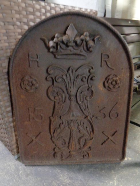 A cast iron embossed fire back initialled HR and bearing date 1536