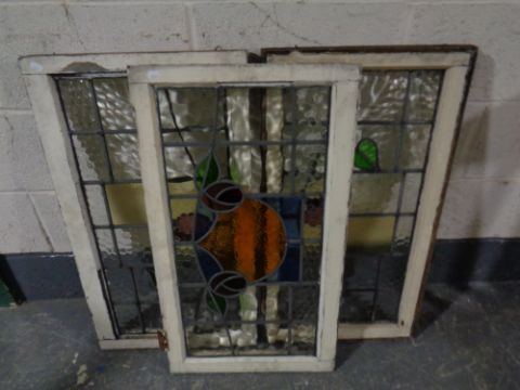 Three antique stained leaded glass windows in frames