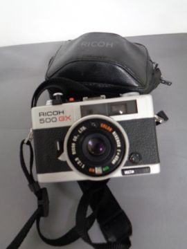 A leather cased set of 10x50 field glasses by Ross of London together with a Ricoh 500 GX camera in case