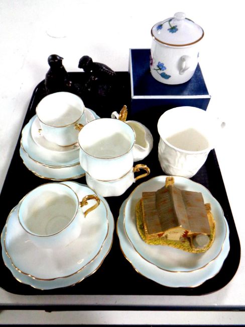 A tray of assorted ceramics : Royal Albert cups and saucers, boxed Royal Worcester preserve pot, John Letts sculptures etc