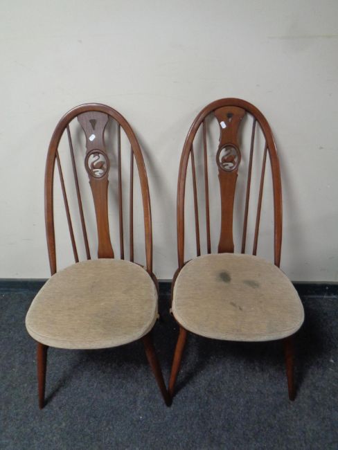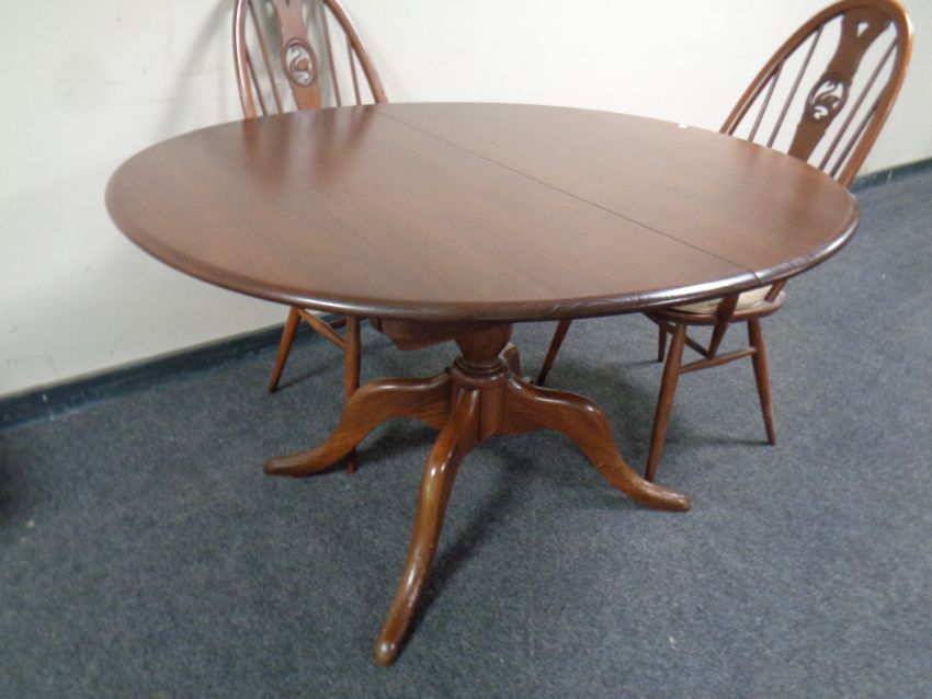 An oval Ercol pedestal extending dining table fitted a leaf together with a set of six Windsor swan backed dining chairs (two carvers, four singles) in an antique finish