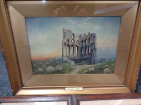 An early 20th century oil painting depicting Tynemouth Abbey in a gilt composite frame, together with a pair of Edwardian oak framed pictures by Sherwood Edwards depicting figures in 19th century dress on a street