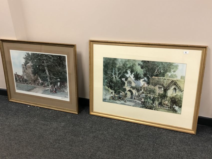 After Sturgeon : A thatched cottage with figures beyond, colour print, 75 x 46 cm, together with a further print by the same artist, signed in pencil (2)