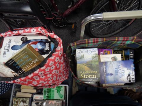 Five shopping trolleys and three crates containing a large quantity of hardback and paperback novels to include romance, thrillers etc