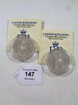 Two Royal Mint Coronation 40th Anniversary silver proof crowns, with certificates of authenticity