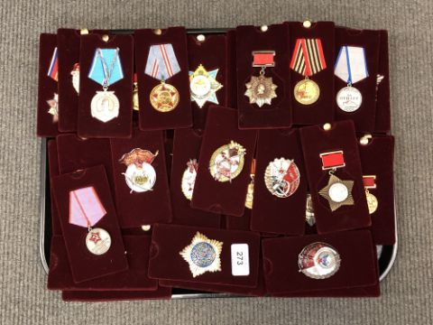 A tray of approximately 40 reproduction Russian badges/medals.