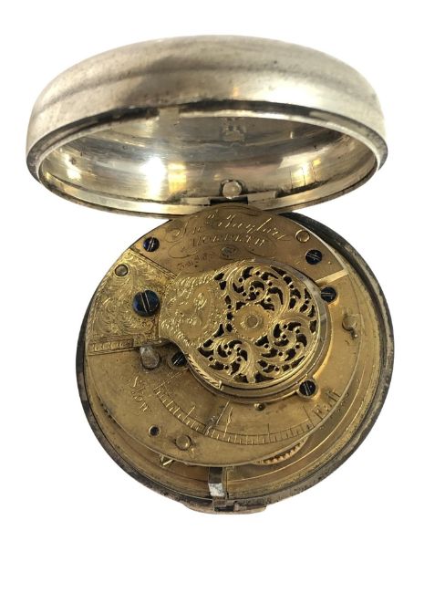 A silver pair-cased pocket watch, the enamelled dial depicting a steam locomotive on a bridge, verge fusee movement signed Jn Taylor, Morpeth and numbered 34869, case hallmarked London 1848