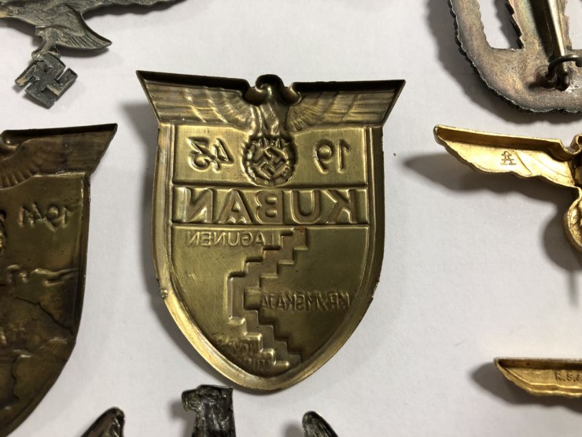 A German Kuban shield badge 1943, A German 1941 1942 Krim (Crimea) Badge, A German Mine Sweeper Badge (all copies) together with a group of German Cap Eagles; to include three white metal examples, two gilt examples and a large NSKOV badge. (9)