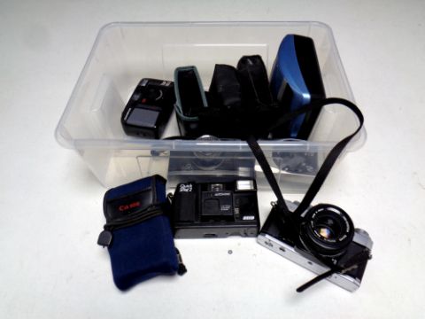 A box containing Olympus OM30 camera, Olympus Trip 35 camera, other cameras including Canon, Polaroid etc
