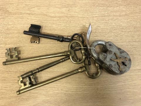 A vintage padlock with key, together with a collection of five further brass and metal keys. (Q)