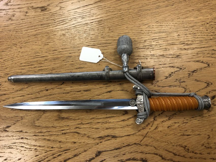 A German Third Reich Army Officer's Dagger by Eickhorn, wrythen orange plastic grip, eagle crossguard, blade with maker's mark, pebbled scabbard with twin suspension hoops, silver wire portapee, velvet backed silver wire hanging straps, overall length 39.5cm.