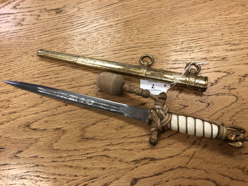 A German Third Reich Naval (Kriegsmarine) Officers Dress Dagger by Carl Eickhorn, gilt eagle pommel, white celluloid grip retaining the wire binding, cross guard with press button release to the reverse, gold portapee, with gilt scabbard and two velvet-backed suspension cords, overall length 42cm.
