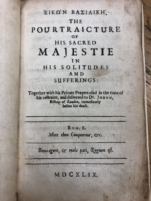 Eikon Basilike - The Pourtraicture of His Sacred Majestie in His Solitudes and Sufferings together with his private prays, used in the time of his restraint, and delivered to D. Juxon, Bishop of London, immediately before his death, Rom 8, a leather-bound volume, dated 1649.