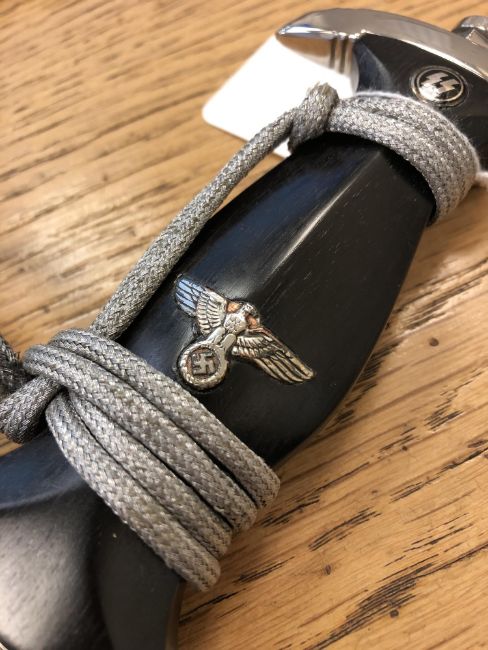 A German Type 1936 chained SS Leaders Dagger & Chain, engraved "Meine Ehre heibt Treue", silver thread portapee, grip inset with eagle and SS runes, overall length 37cm. (NB Possibly a marriage of original and later parts)