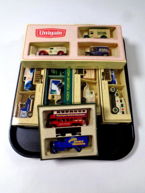 A tray containing six Lledo Days Gone Railway and Unigate die cast car packs