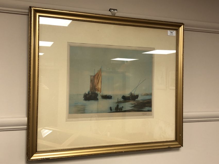 A Arnold : Fishing Boats in Calm Waters, etching in colours, signed in pencil, with margins, 27 cm x 35 cm, framed.
