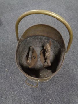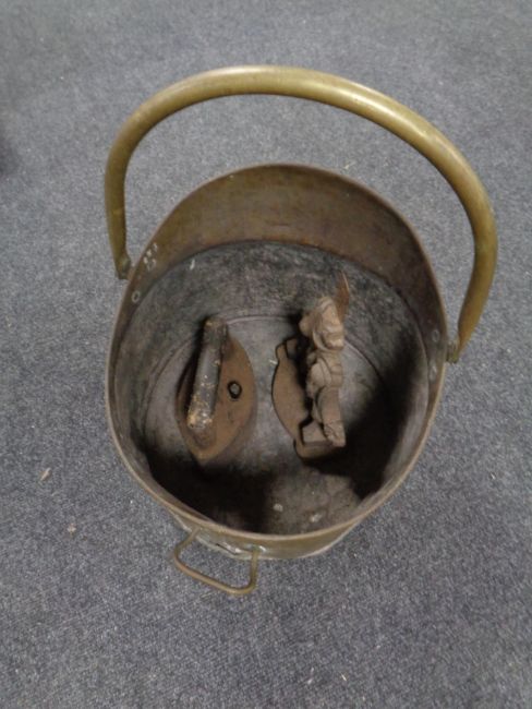 A Victorian brass swing handled coal receiver together with an iron and a cast iron doorstop