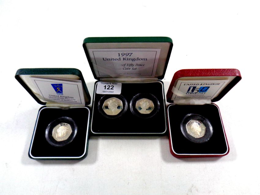 Three Royal Mint silver proof fifty pence coins, Fifty Years of the NHS, 150 Years of Public Libraries, together with a 1997 twin coin set, with certificates of authenticity, cased