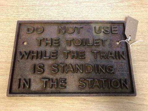 A metal railway plaque - "DO NOT USE THE TOILET WHILE THE TRAIN IS STANDING IN THE STATION", 19 cm x 29 cm.