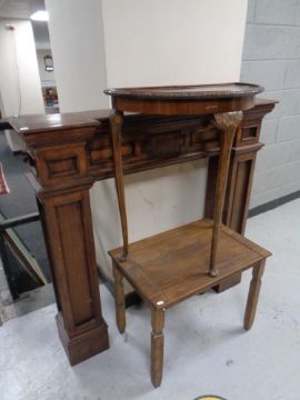 An oak fire surround together with a demi lune occasional table and one further low table