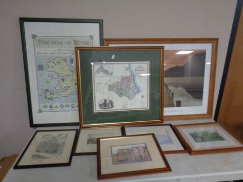 A coloured map, The County of Durham, framed, together with seven other pictures to include a Mel Allen print, Ullswater, signed prints etc