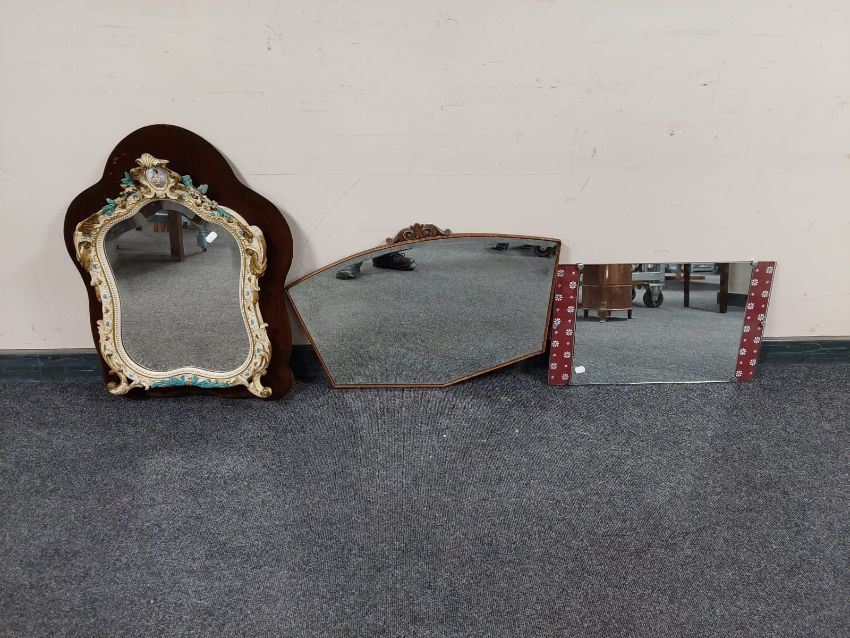 A continental shaped mirror with cherub decoration together with an early 20th century oak bevelled edge mirror and one further frameless mirror