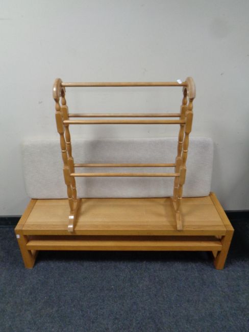 A contemporary oak bench with cushion and under shelf together with a towel rail