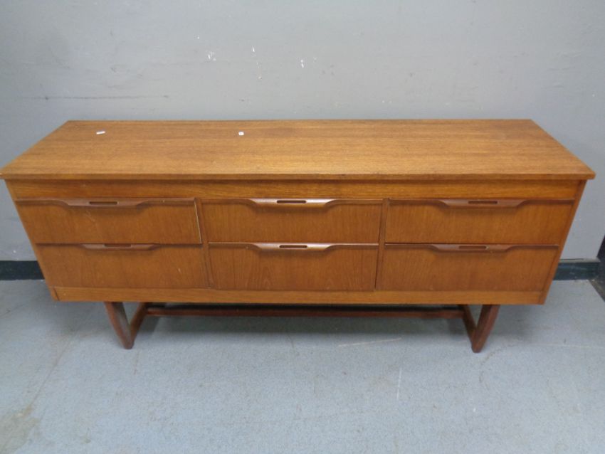 A 20th century teak six drawer chest on raised legs, width 152 cm