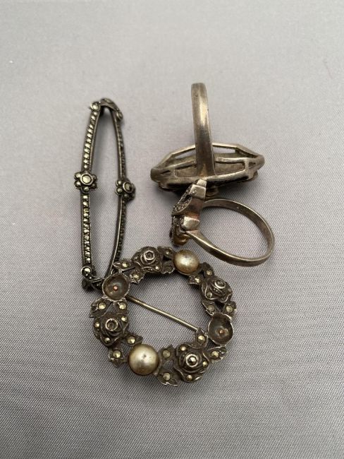 Two silver marcasite rings together with two silver brooches
