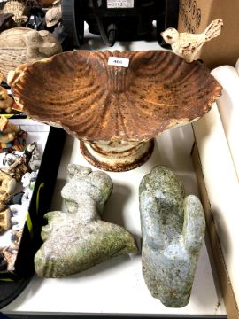 A cast iron bird bath together with two stone carvings