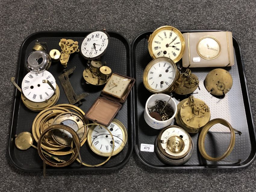 A tray containing a quantity of clock parts and components, mantel clock, Ingersol travel clock etc