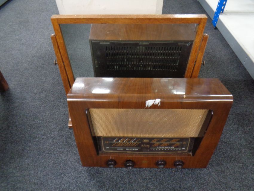 A 1930's R.G.D. walnut cased valve radio and an oak swing dressing table mirror