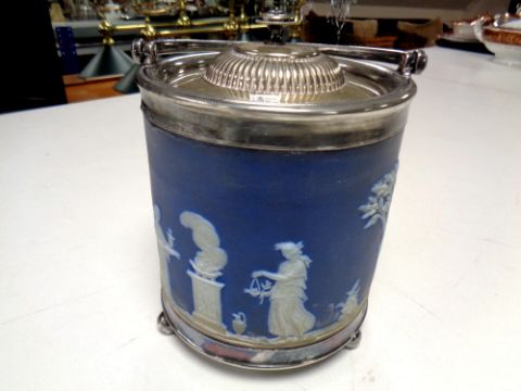 A Wedgwood Jasperware silver plated lidded biscuit barrel