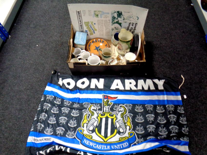 A box containing tin sign Britain's Best Beers, Newcastle Brown Ale ashtray, vintage tin, ceramic mugs etc