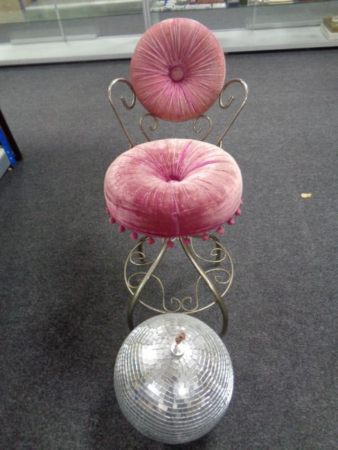 A metal dressing table chair upholstered in a pink dralon together with a glitter ball