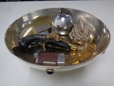 A silver plated ecclesiastical style bowl containing six assorted novelty pocket and table lighters