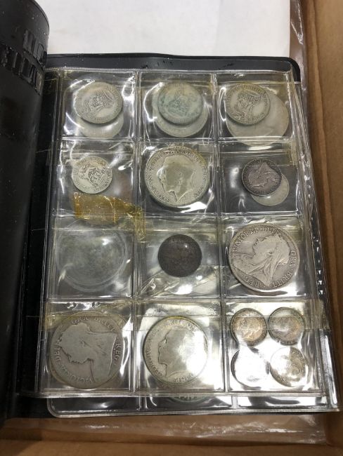 A collection of First Day covers, stamps, foreign bank notes, decimal coins in wallet, wallet of coins including Victorian half crown, silver three pence pieces etc