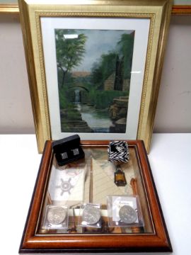 A watercolour of a waterfall, indistinctly signed, together with a nautical montage in frame, costume brooch, cuff links, five pound coin and two crowns