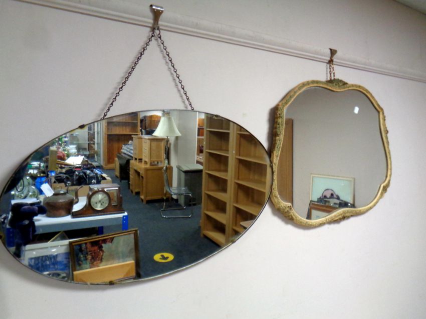 An early 20th century oval frameless mirror together with a further shaped mirror in composite frame