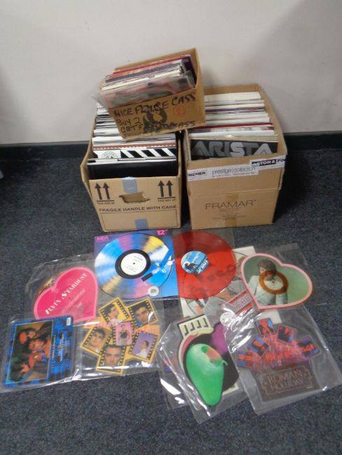 Three boxes containing 12 inch vinyl promo singles, ten inch singles and picture discs