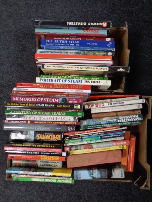 Two boxes containing hardback and paperback volumes relating to railways and steam trains