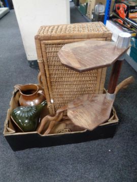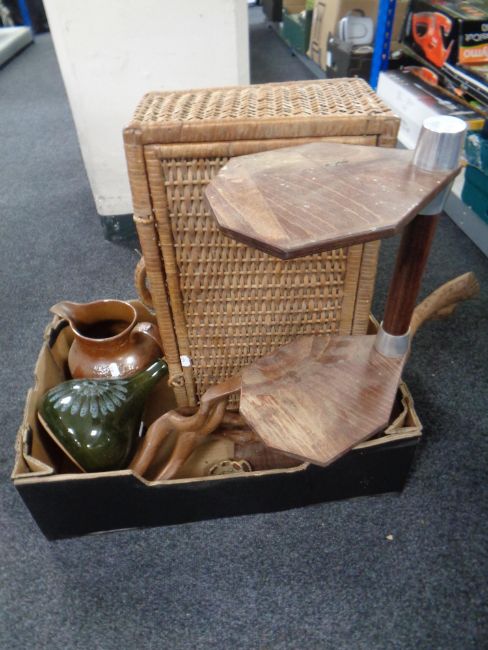 A box of vintage picnic basket, antique glazed pottery jug, Devon lotus pottery lamp base etc
