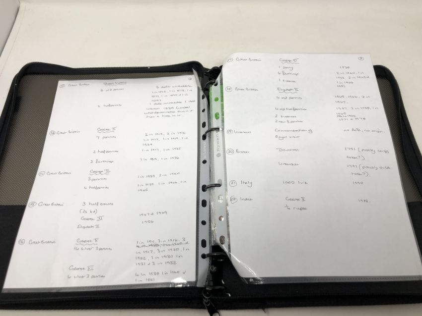 An album containing a quantity of antique and later coins, bank notes, silver three pence pieces, etc