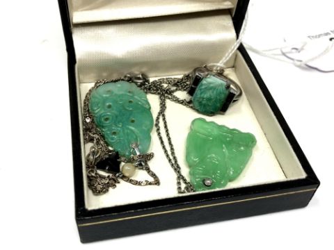 A continental white metal Art Deco style dress ring stamped 935 together with matching pendant on sterling silver chain, together with a further similar pendant on chain (3)