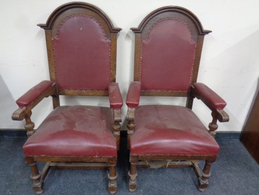 A pair of Edwardian oak high backed armchairs upholstered in a red leather
