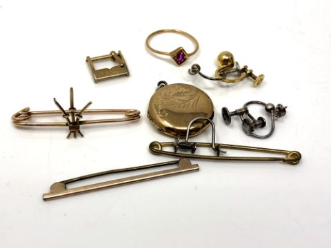 A 9ct gold bar brooch, 1.8 grams, together with two further bar brooches, a yellow metal ring, a yellow metal buckle, five earrings and a locket