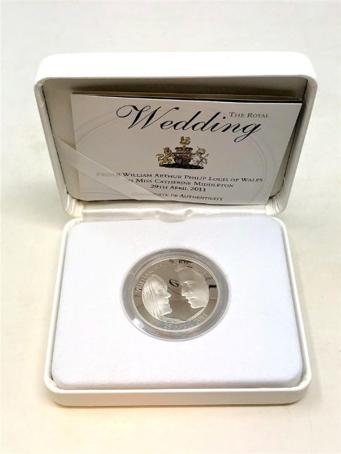 A Royal Mint Prince William and Kate Middleton Royal Wedding Silver Proof Crown, boxed with certificate of authenticity.