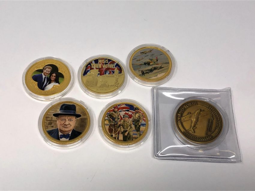 Six various commemorative coins relating to D-Day, Churchill, Prince Harry and Meghan Markle etc. (6)