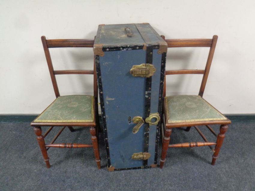 An early 20th century metal bound travelling trunk together with a pair of Edwardian bedroom chairs