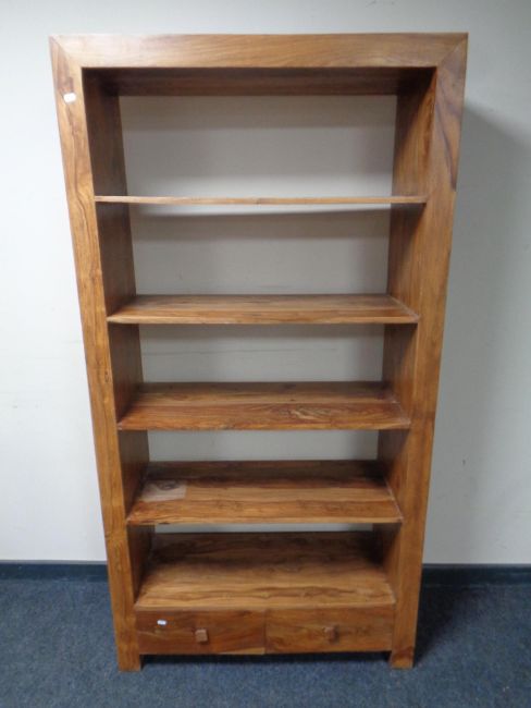 A set of sheesham wood open bookshelves fitted two drawers beneath, height 178.5 cm, width 93 cm